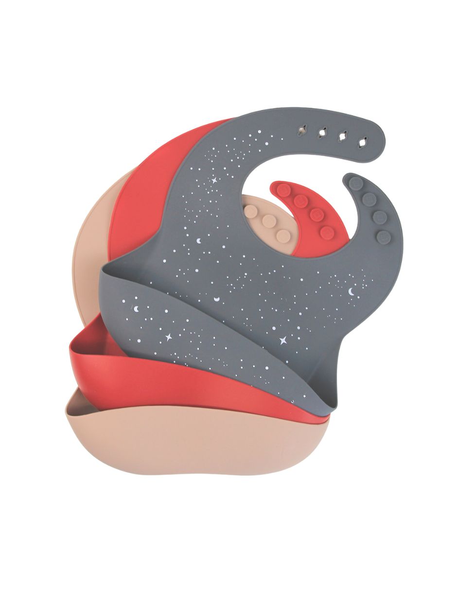 Baberos de Silicón para Bebé con bolsa atrapa comida - Set de 3 - Gris Estampado, Vino y Arena