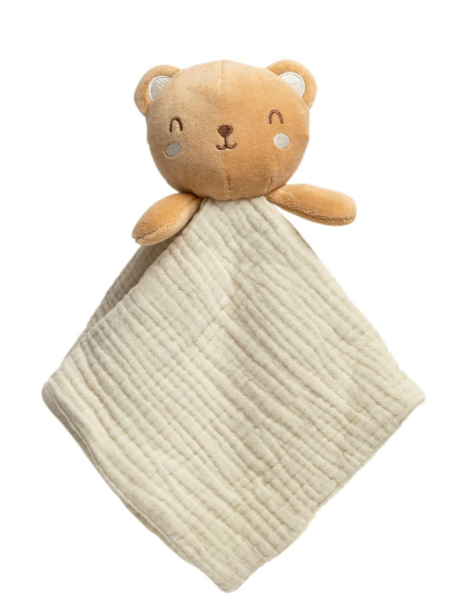 Hecha con 100% algodón orgánico y muselina de algodón, presenta una cabeza de felpa con brazos móviles y una manta de muselina suave y abrazable, su cara amigable seguramente capturará el corazón de tu hij@.