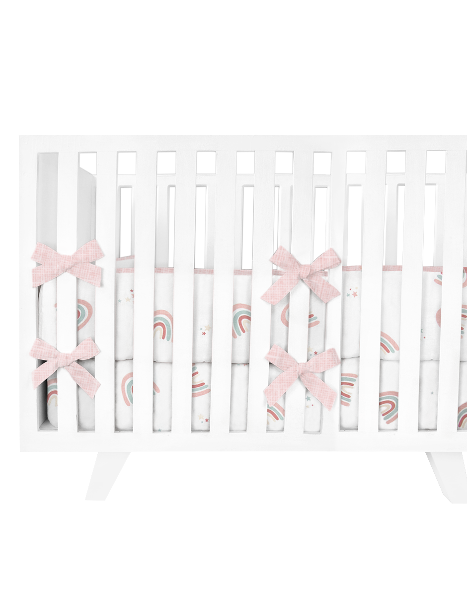 El protector acolchado (bumper) evita que tu bebé se golpee con los barrotes de la cuna. Se fija con moños de tela para mantenerse firme y seguro.